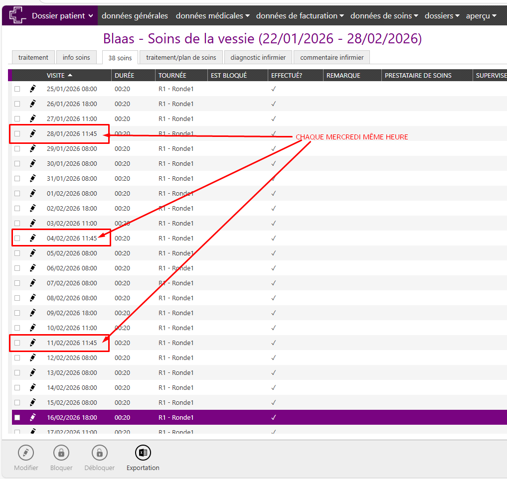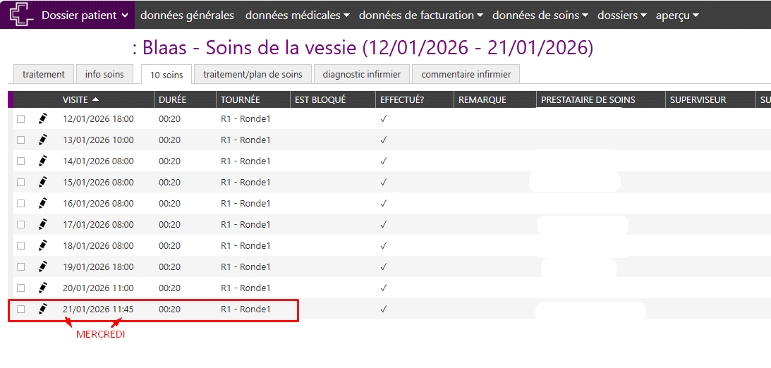 En pratique, les plannings sont toutefois régulièrement adaptés (p. ex. modification de la tournée ou de l’horaire). Par conséquent, ces données initiales ne sont souvent plus pertinentes au moment de la prolongation, et le soin prolongé peut alors être planifié sur une tournée ou à une heure incorrecte.