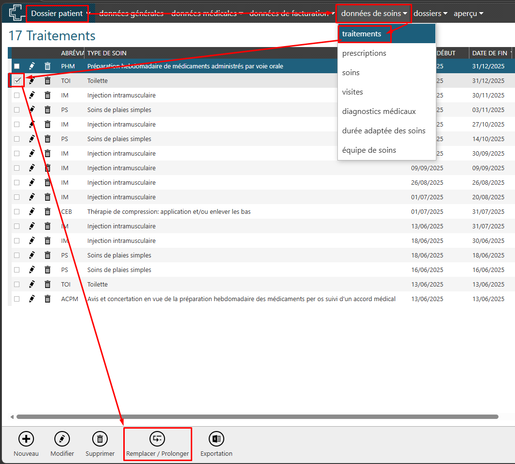 Afin de prolonger un soin, allez dans le dossier patient => données de soins => traitements. Selectionnez le traitement que vous désirez prolonger et cliquez en base de votre écran sur le bouton "remplacer/prolonger" et choisissez "prolonger".