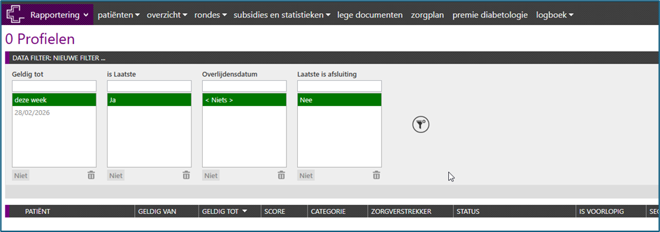 Na toepassing van deze filters toont het scherm enkel de profielen waarvan de Katzschaal verlengd mag worden.