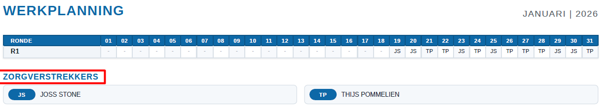 Nadat u op 'rapport maken' hebt geklikt, kunt u dit document downloaden. Op de gewerkte dagen, worden de afkortingen van de vermelde zorgverstrekkers weergegeven. Ter info, hieronder stuur ik u printscreen van het overzicht in dit document: